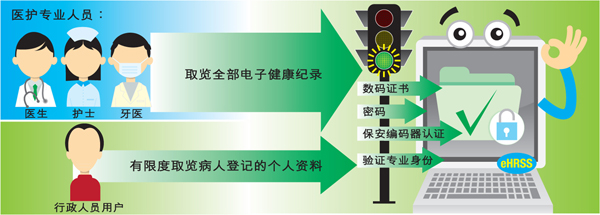 医护提供者只能取览所照顾病人的健康纪录,并须事先获病人同意。系统同时会按不同医护提供者的临床需要或职能,设立取览权限机制。互通系统推行初期,医护提供者可给予辖下医生、护士和牙医权限,取览所照顾病人的健康纪录。行政人员用户只能有限度查阅病人登记的个人资料,其权限不包括病人的健康纪录。所有医护人员用户登入电子健康纪录互通系统时,须先通过组合认证核实身分,例如密码、数码证书或保安编码器认证等。互通系统亦会透过中央数据库验证用户的专业身分,才会容许他们取览资料。